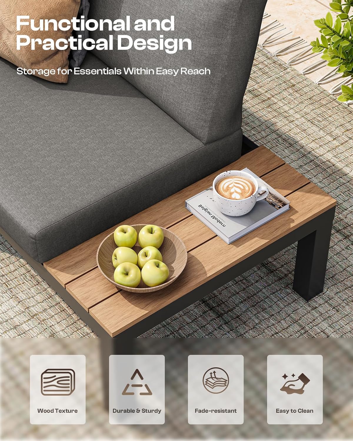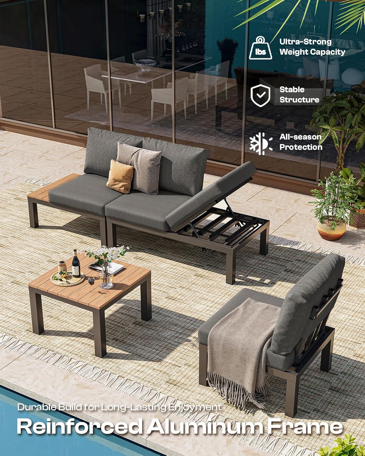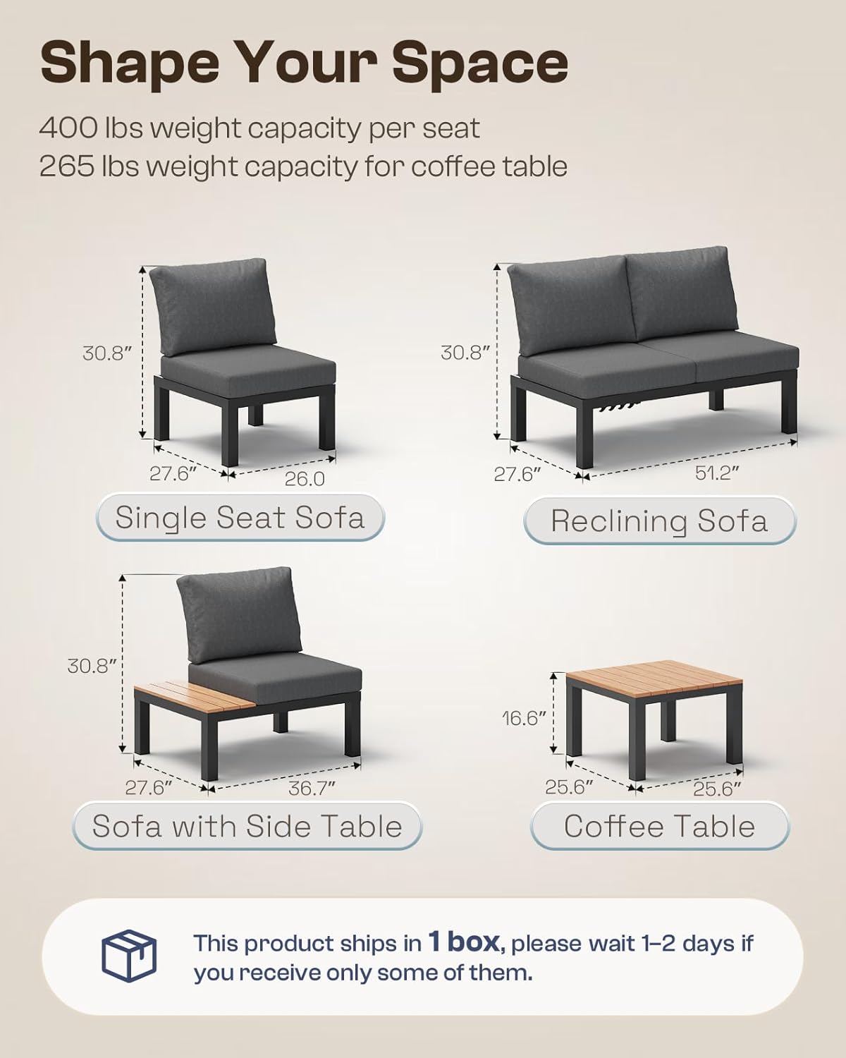 Oasbira Aluminum Outdoor Patio Sofa Set, 2 Seats Modular Sectional Sofa with Side Table, Thick & Removable Cushions, All-Weather Outdoor Conversation Sets for Garden & Yard, Graphite